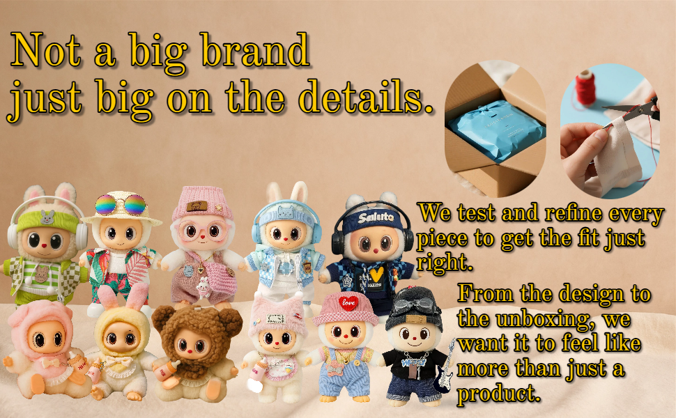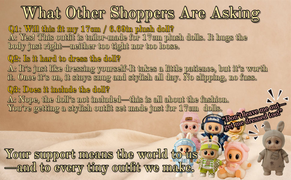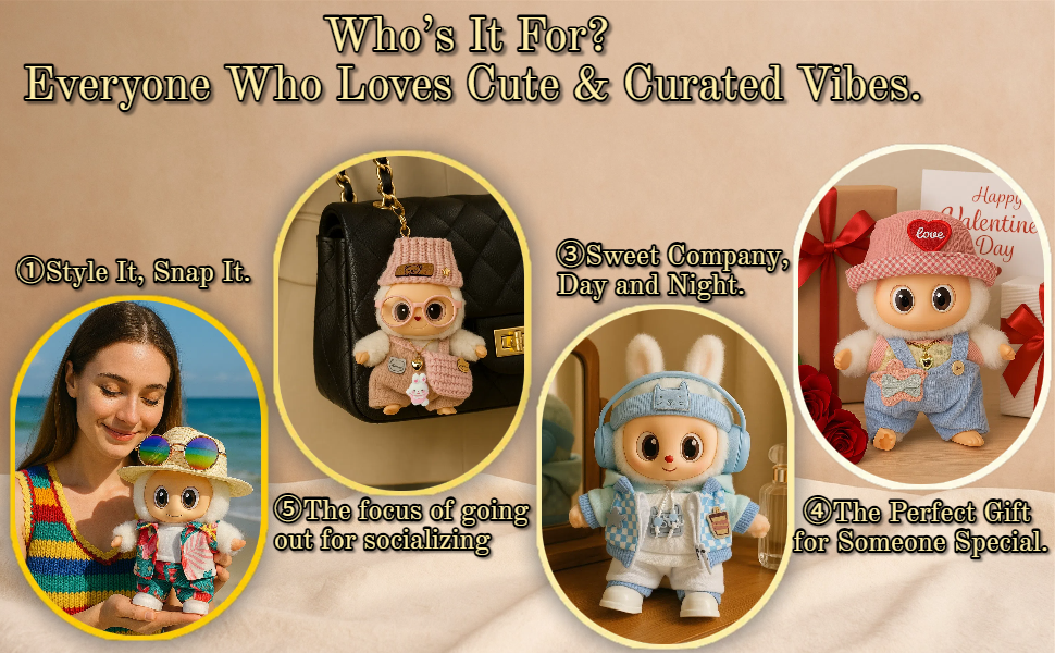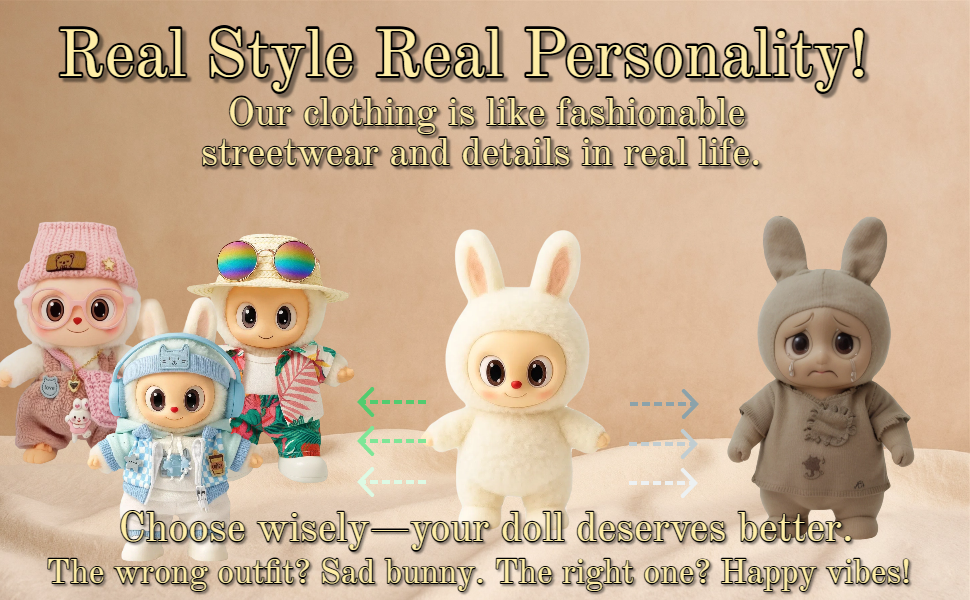 This 6-piece blue streetwear outfit is specially designed for 17cm/6.69in collectible plush dolls. It includes a headphone-style headband, plaid jacket, hoodie, white pants, and shoes. Perfect for casual display, photography, or daily dress-up fun.